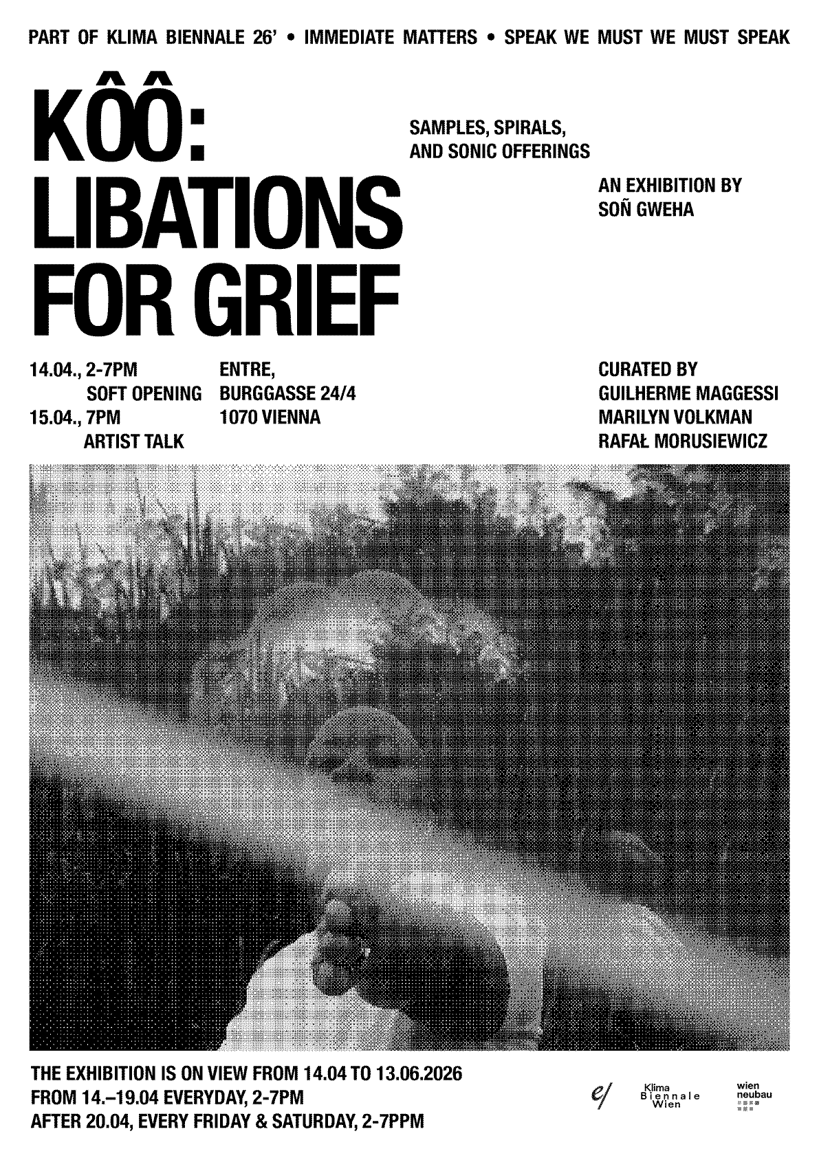 Kôô: Libations for Grief (Samples, Spirals, and Sonic Offerings) takes place within the Klima Biennale’s Immediate Matters program SPEAK WE MUST WE MUST SPEAK, a collective exhibition of 10 independent spaces curated by Anne Faucheret. You can find more information about the overall program here.